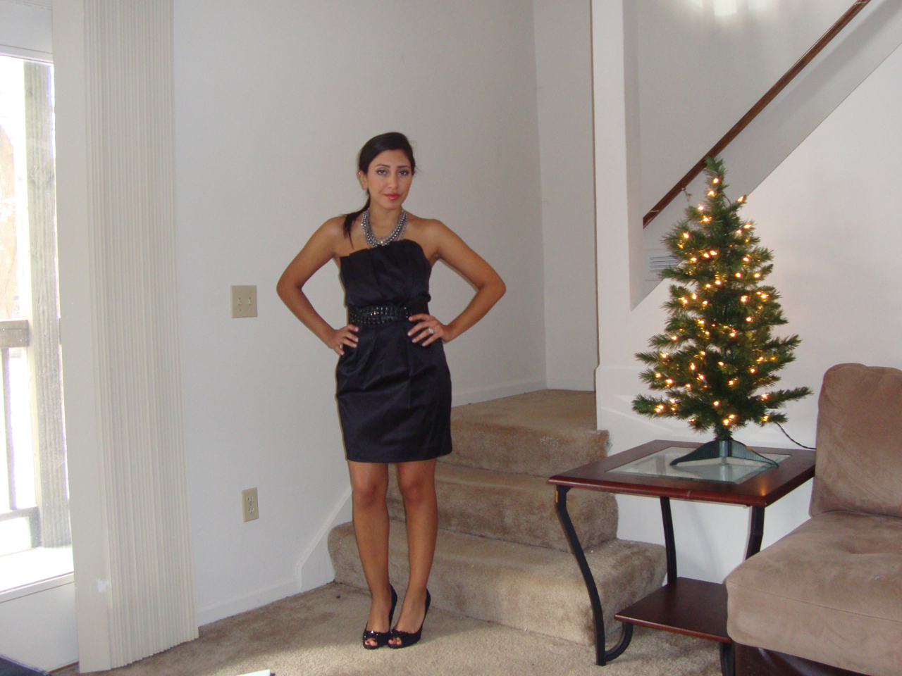 LBD with black rhinestone belt. Accessorized with rhinestone black pumps and a chunky necklace. Hair pulled into a simple pony tail to highlight the statement necklace.